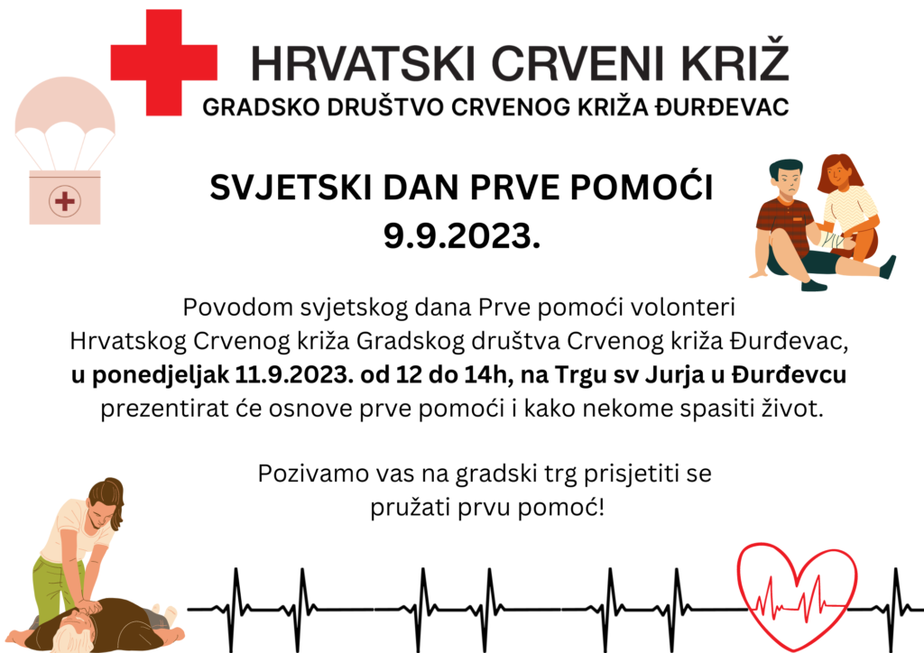 Upravo s tom namjerom, volonteri Gradskog društva Crvenog križa Đurđevac će povodom Svjetskog dana prve pomoći u ponedjeljak, 11.9.2023. godine od 12 do 14 sati prezentirati osnove prve pomoći.