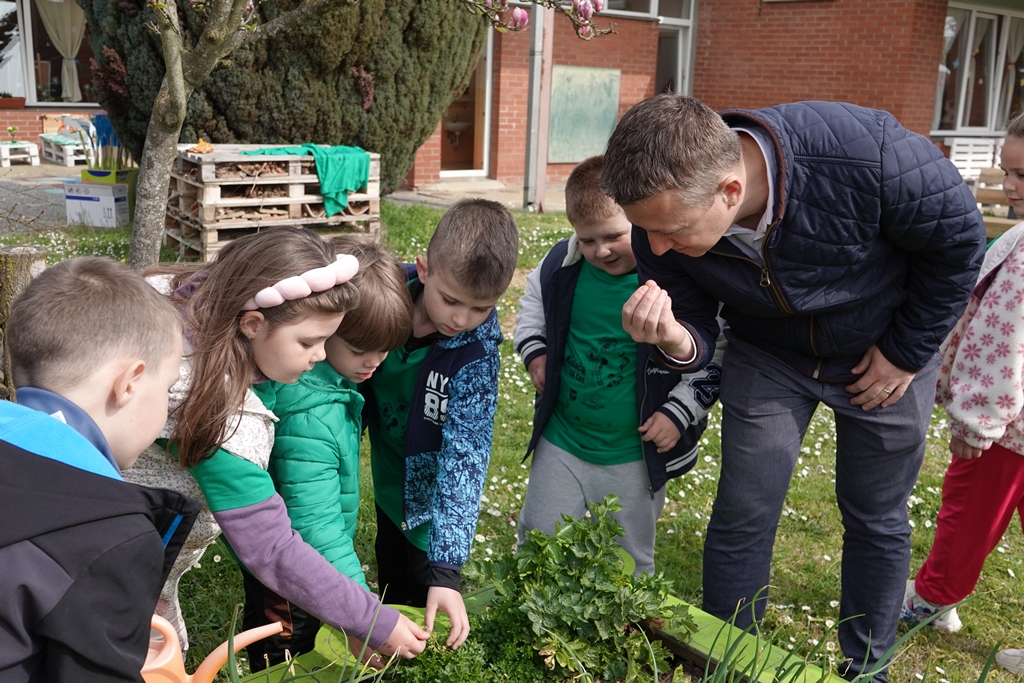 Vrtićarce je razveselio i prigodnim poklonima – grabljicama, metlicama i vrtnim alatom koji će koristiti u svakodnevnim aktivnostima uređenja vrta, što je izazvalo veliko oduševljenje među djecom. U njihovom vrtu pridružio im se i u praktičnom radu pa su zajedno posadili luk u vrtnu gredicu i zalili ga. Djeca su pritom pokazala zavidno znanje te objasnila kako i kod kuće pomažu u brizi o vrtu.